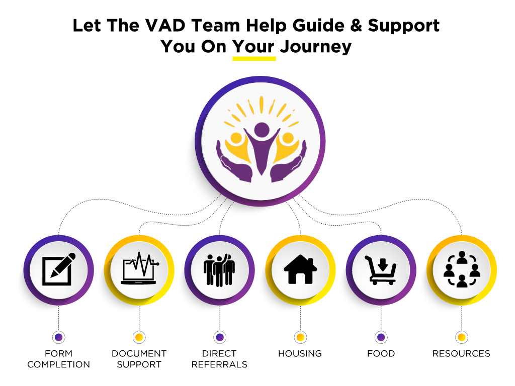 iVAD is the side of VAD that works with individuals on one-to one consultations and form assistance. We help people fill out forms, get photocopies of needed documents and then get the applications ready to mail. We work with people in various stages of their journey and needs, we assist and make referrals to ensure that they have access to housing, food and other basic need resources.