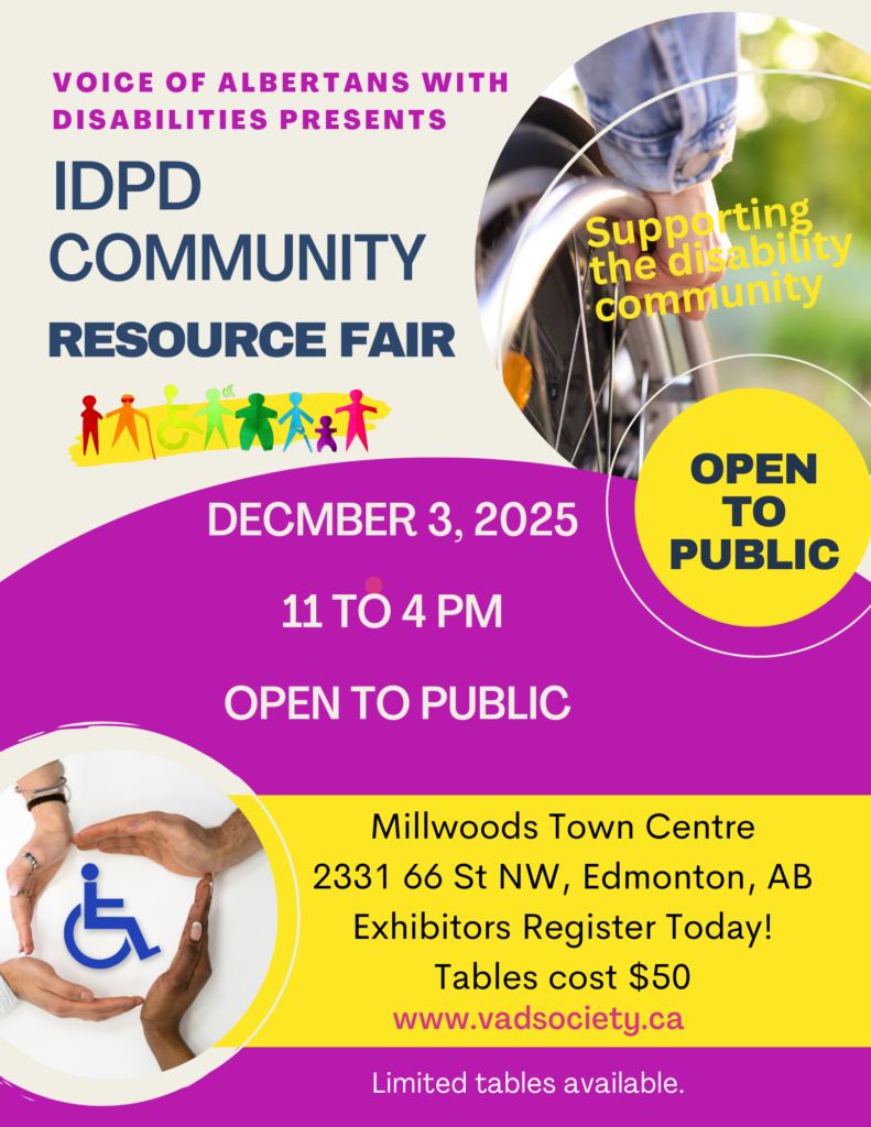 Voice of Albertans with Disabilities, (VAD) Is inviting you to participate in the 2025 IDPD Community Resource Fair on December 3, 2025 as an exhibitor.